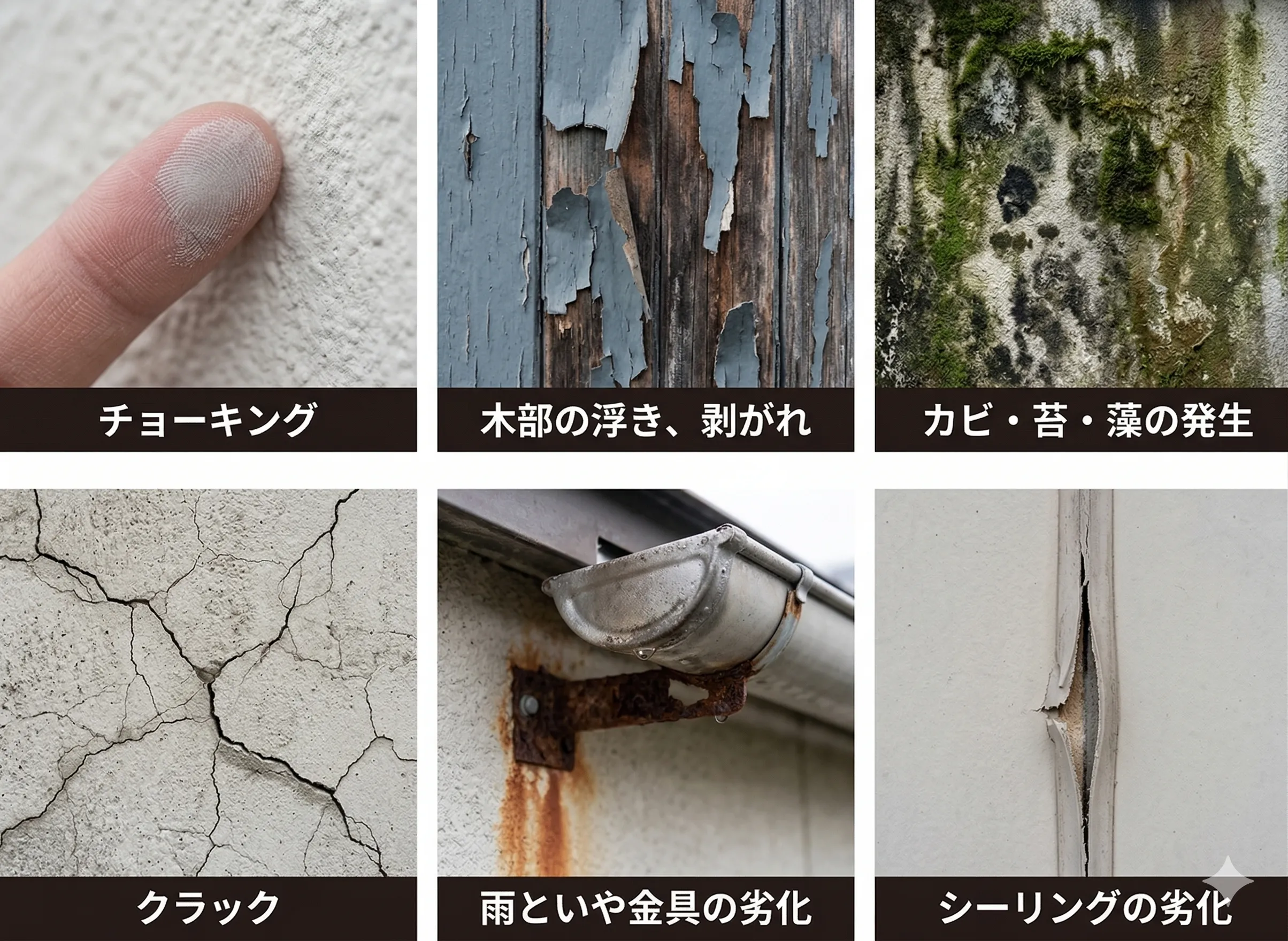 以下の6つのサインが1つでも当てはまる場合、塗り替えを検討すべき危険信号です。